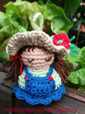 Eigenlijk wilde ik een nieuwe sleutelhanger voor mijzelf, maar daarvoor is ze te groot. Ik gebruikte als basis het patroontje voor een gelukspoppetje uit het boekje "gelukspoppetjes haken" van Annemarie van Arts en heb me verder een beetje laten inspireren door een foto op Pinterest, afkomsitg van een blog "Made by Leonie". Het was een leuk werkje, maar een sleutelhanger heb ik nu nog steeds niet :p